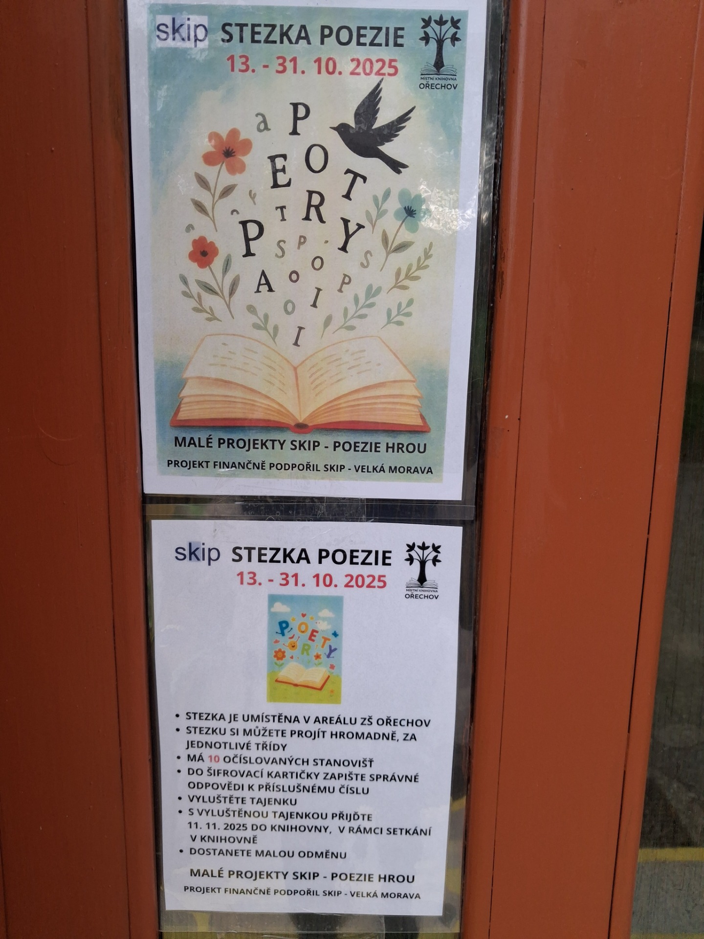 V rámci projektu Poezie hrou si děti ze ZŠ a MŠ Ořechov prošli stezku poezie, která byla umístěna v areálu ZŠ. Děti dostaly odměnu za vyluštěnou tajenku.