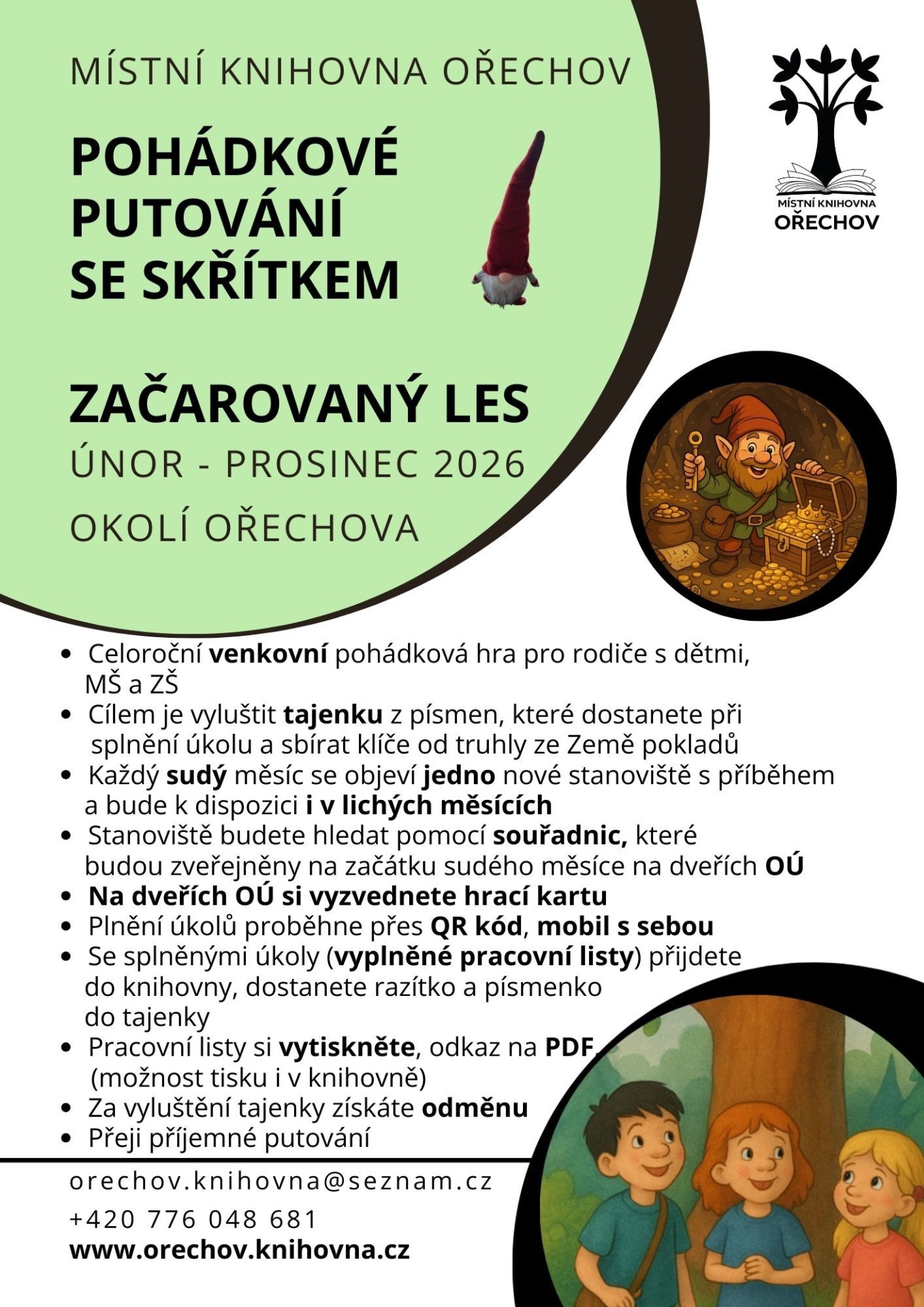 Pokud jste prošli všech 6 stezek, přijďte do knihovny s vyplněnými kartičkami, dostanete žetony a zároveň si odnesete šifrovací kartu s písmenky stezky Putování Ořechovem.