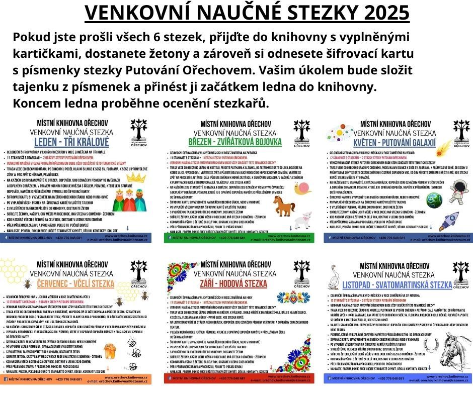 Pokud jste prošli všech 6 stezek, přijďte do knihovny s vyplněnými kartičkami, dostanete žetony a zároveň si odnesete šifrovací kartu s písmenky stezky Putování Ořechovem.