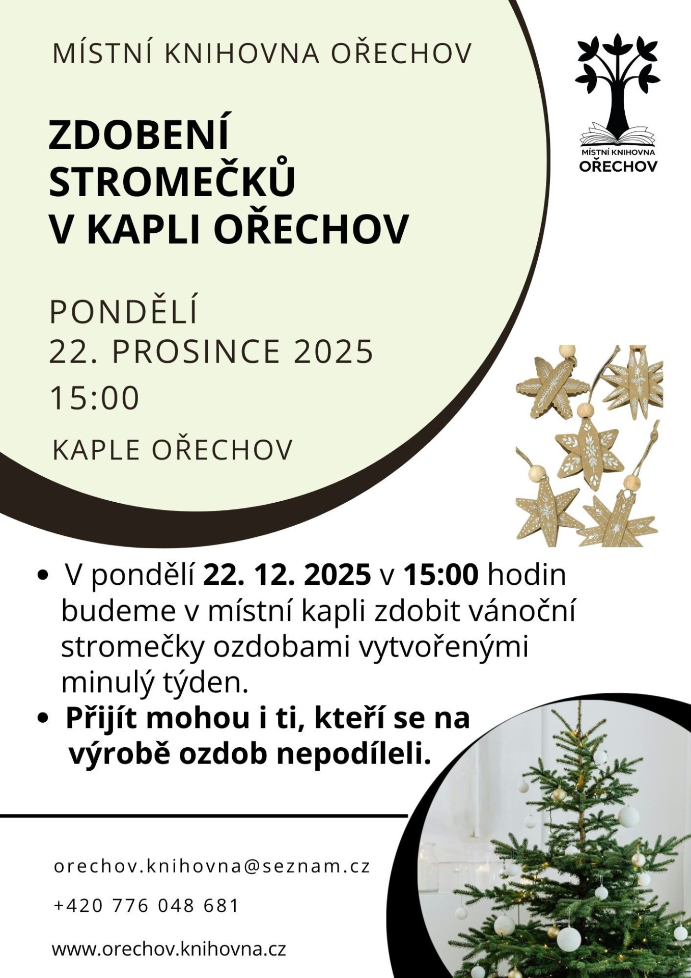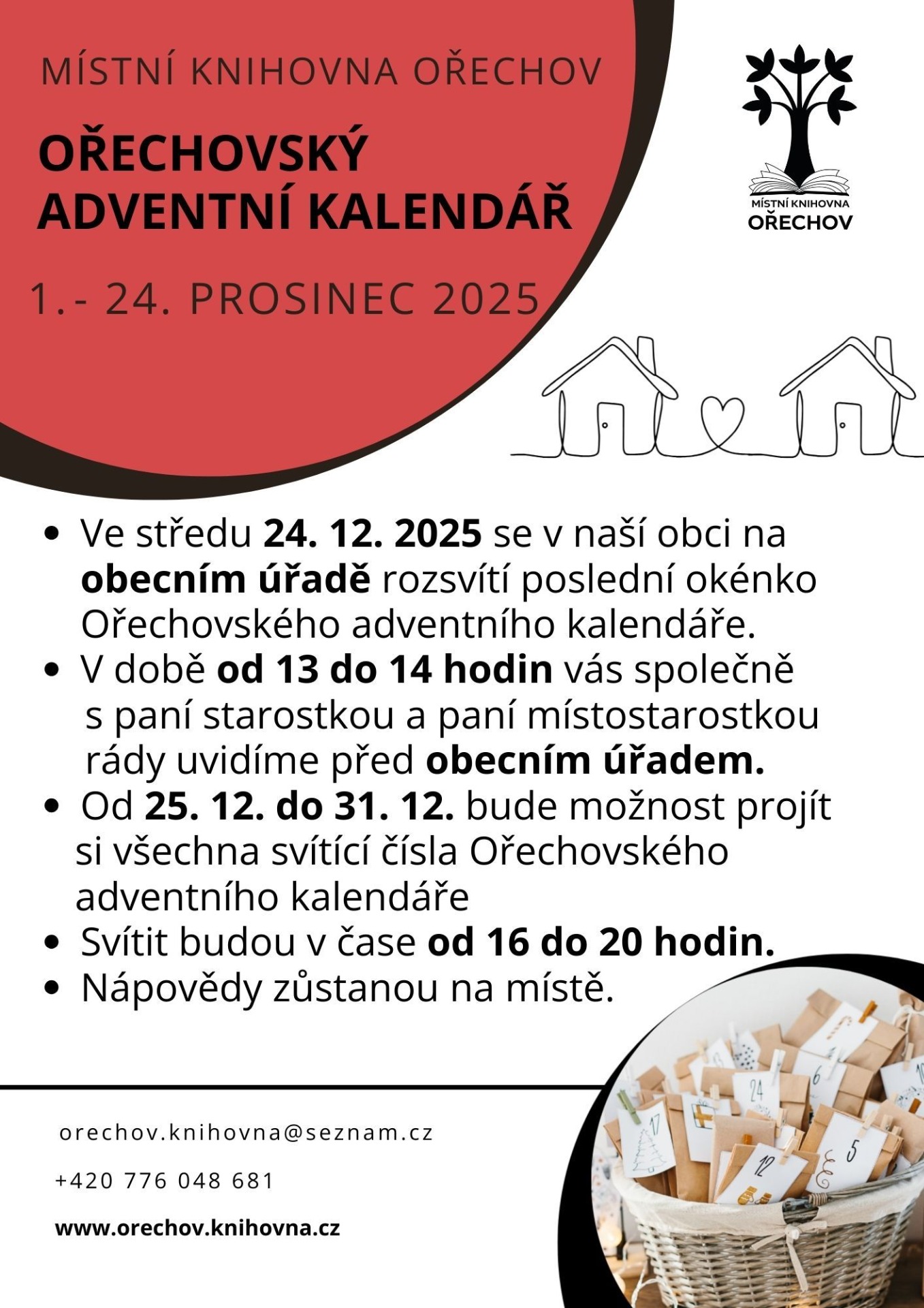 Zveme vás k procházce naší obcí v rámci akce Ořechovský adventní kalendář, která se uskuteční v době od 1. do 24. prosince, kdy se denně postupně v čase od 16.00 do 18.00 hod. budou rozsvěcovat čísla v různých domech.