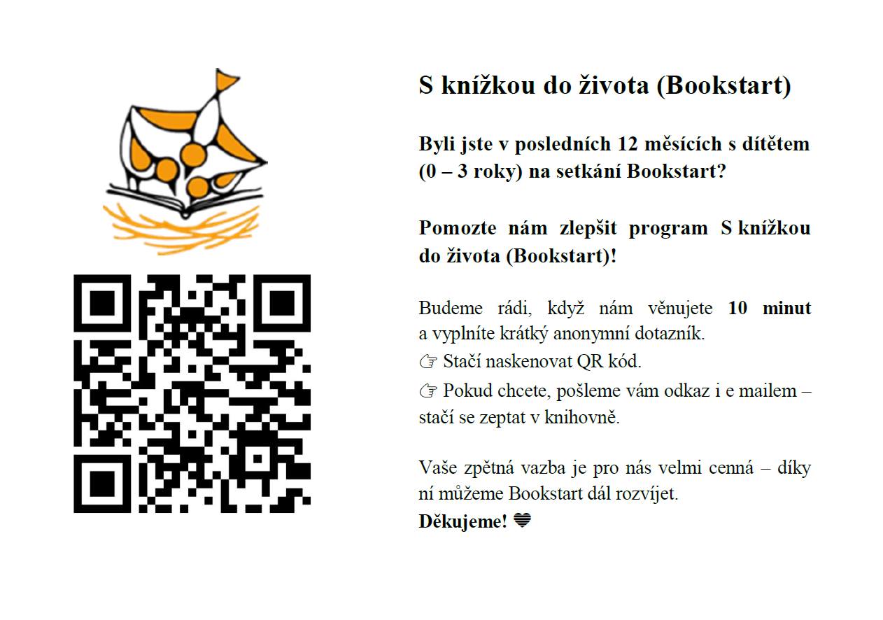 vy, kteří se účastníte setkávání projektu Bookstart, S knížkou do života, v naší knihovně, prosím o vyplnění dotazníku od 1. do 31. 10. 2025.